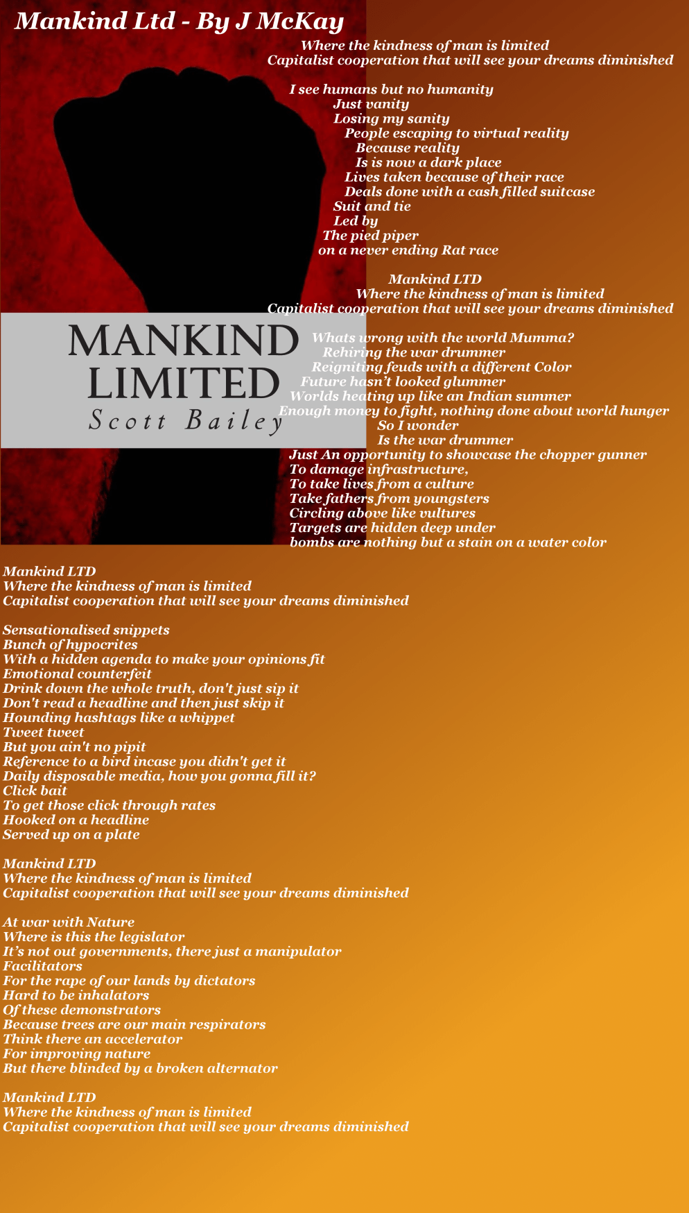 I was surprised to get a message from a friend and colleague – a rap poem – inspired by my novel Mankind Limited.